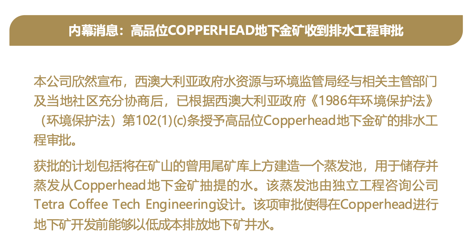 內(nèi)幕消息:高品位COPPERHEAD地下金礦收到排水工程審批