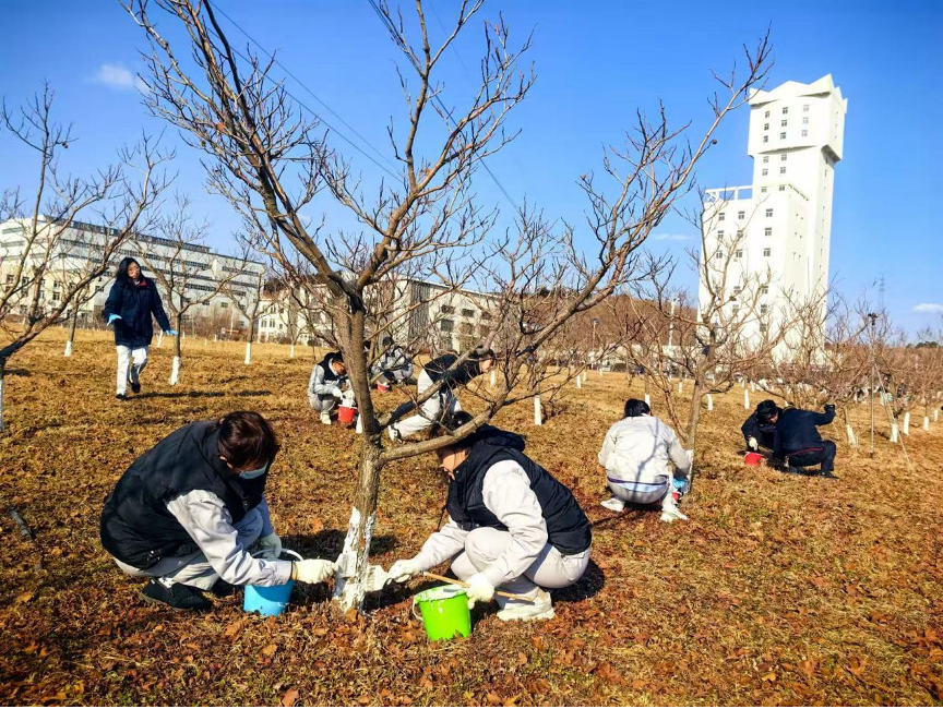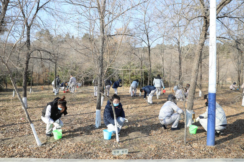 當天上午氣溫較低,但難掩職工們的熱情?;顒又兴麄儍扇艘唤M,以分配好的枝條長度為標尺,認真將調配好的樹木防腐防蟲漆均勻地涂刷在樹干上,給礦區道路兩側綠化樹、榆樹林、蘋果園、李子園的數千棵樹木披上一層潔白的“保護衣”?!叭诵凝R、泰山移”“人多力量大”“這一次真是有了建設綠色礦山、花園式礦山的參與感”,職工們一邊參與活動一邊抒發著內心的感受。